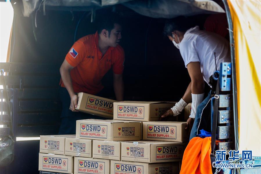 4月2日,在菲律宾帕赛城,工作人员在搬运为加强社区隔离准备的救援物资。 新华社发(乌马利 摄)