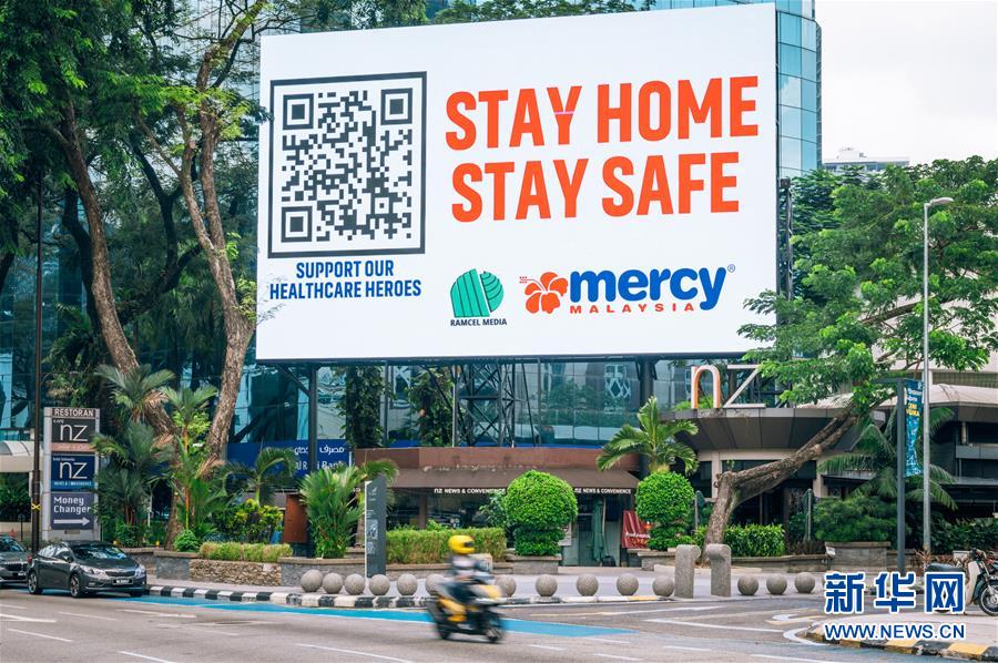 4月2日,在马来西亚吉隆坡,一名摩托车骑手驶过一块显示有“待在家,保平安”字样的电子显示屏。 马来西亚卫生部2日发布的新冠肺炎疫情数据显示,该国新增208例确诊病例,累计确诊3116例;新增治愈122例,累计治愈767例;累计死亡50例。 新华社记者 朱炜 摄