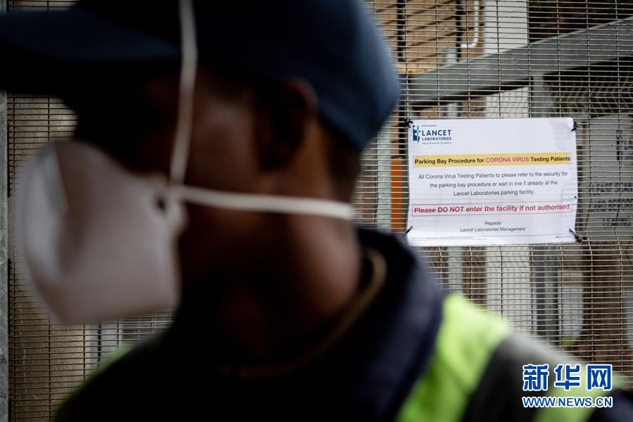 4月2日,在南非约翰内斯堡,一名安保人员在“得来速”检测点门口执勤。 受疫情影响,南非已经实施全国范围“封城”。为了更加安全、快速地完成新冠病毒检测和减少交叉感染风险,南非约翰内斯堡设立“得来速”式新冠病毒检测站 ,为车上人员提供免下车检测服务。 新华社发(耶希尔摄)