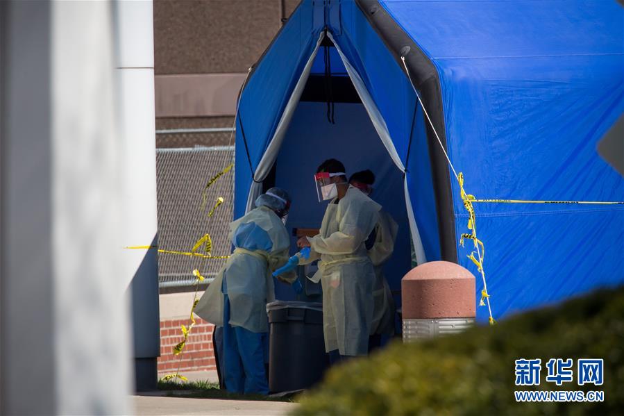 4月2日,在美国纽约布鲁克林一家医院外,医护人员在用于检测新冠病毒的帐篷旁工作。新华社发 (郭克摄)