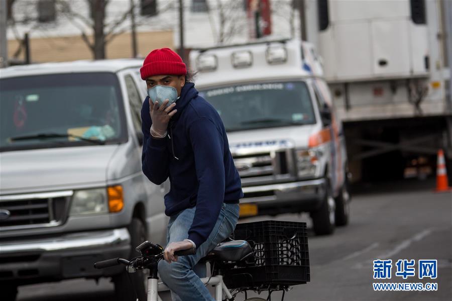 4月2日,一名男子骑车经过美国纽约布鲁克林一家医院。 新华社发 (郭克摄)