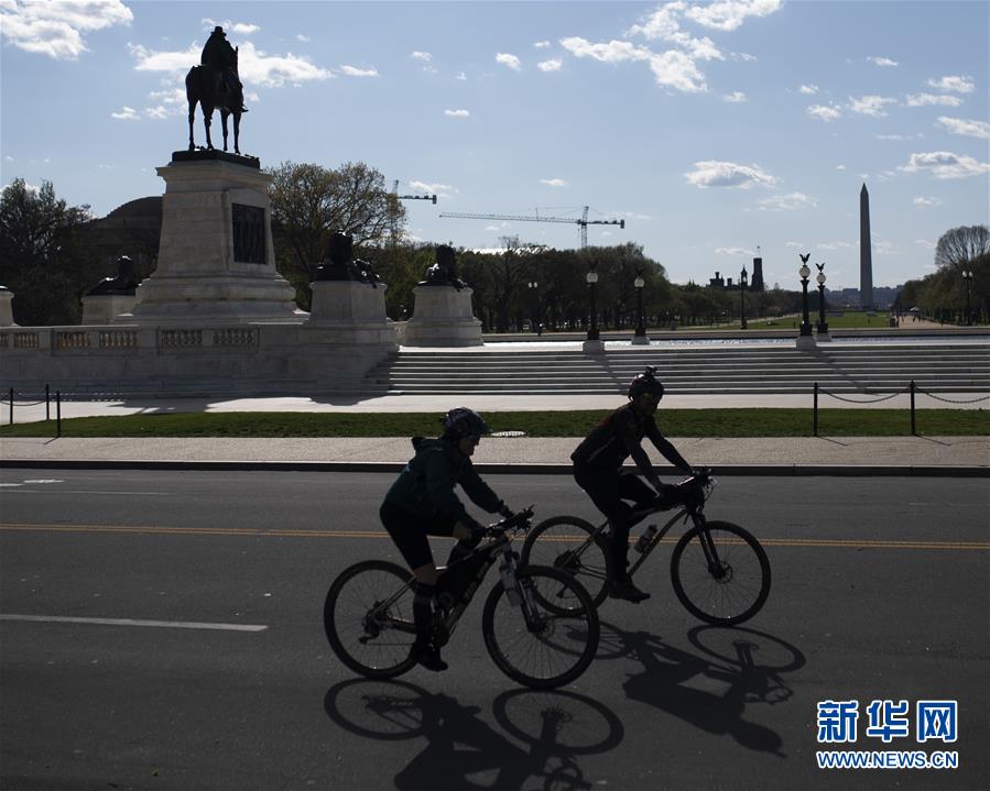 4月2日,在美国首都华盛顿,人们在空旷的街道上骑车。新华社记者 刘杰 摄