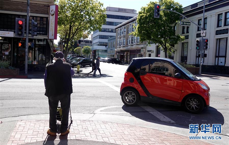 4月2日,在美国加州旧金山湾区圣马特奥市,市民在人行横道等候。新华社记者吴晓凌摄