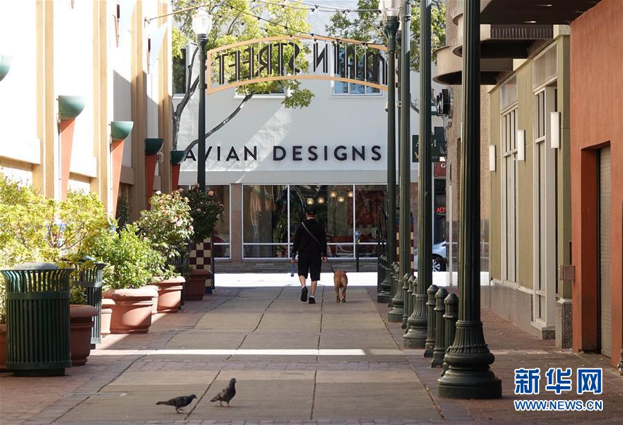 4月2日,在美国加州旧金山湾区圣马特奥市,一名市民在遛狗。新华社记者吴晓凌摄