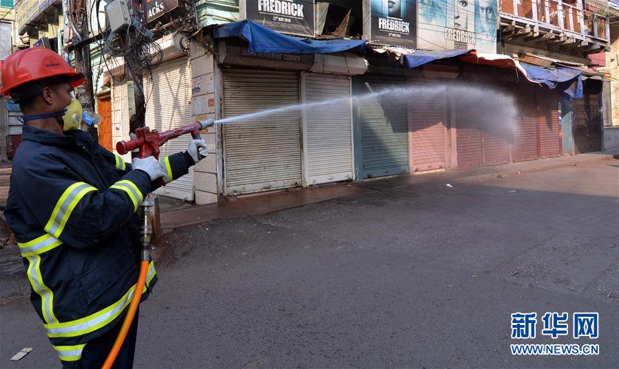 4月2日,在印度阿萨姆邦高哈蒂,消防员在街头喷洒消毒剂。新华社发