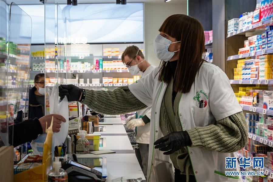 4月2日,在法国巴黎一家药店,收银台安装了防护板。 法国公共卫生部门2日公布的数据显示,法国累计新冠肺炎确诊病例升至59105例,较前一日增加2116例。 新华社发(奥雷利安·莫里萨尔摄)
