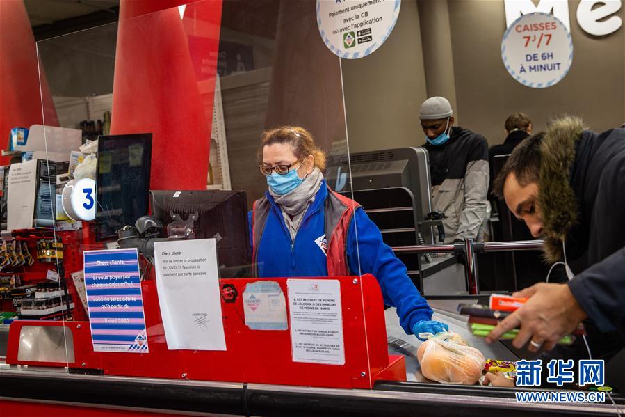 4月2日,在法国巴黎一家超市,收银员戴着口罩和手套在防护板后工作。 法国公共卫生部门2日公布的数据显示,法国累计新冠肺炎确诊病例升至59105例,较前一日增加2116例。 新华社发(奥雷利安·莫里萨尔摄)
