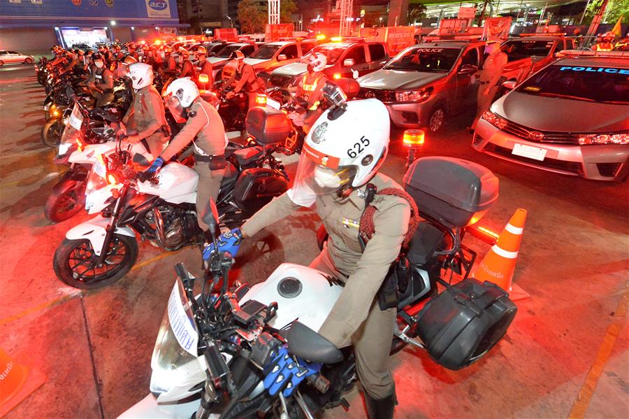 4月3日,泰国曼谷的警察集结准备执行宵禁任务。 泰国总理巴育4月2日宣布于4月3日起在全国范围内实施宵禁,宵禁时间为晚10点至次日凌晨4点。宵禁期间除必要出行的人员外,其他民众一律不得离开住所,违禁者可能面临最高2年的监禁。 新华社发(拉亨 摄)