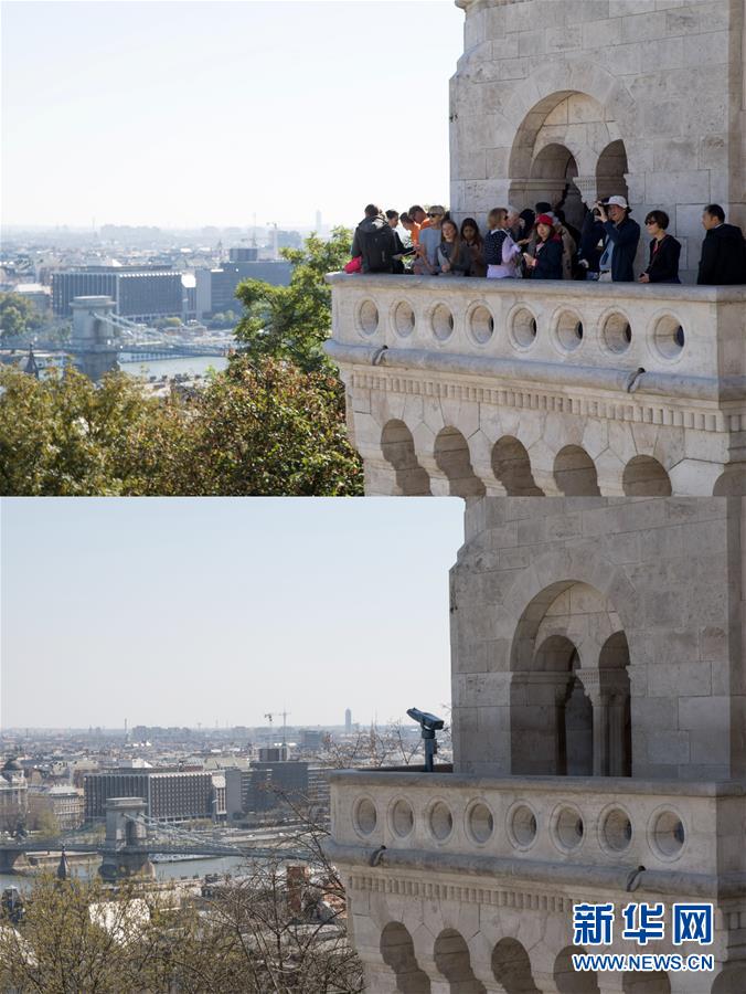 拼版照片显示:(上) 2018年9月27日,游客在匈牙利首都布达佩斯的著名景点渔人堡游览。(下)2020年4月2日,渔人堡空无一人。 为应对新冠肺炎疫情,匈牙利总理欧尔班3月27日宣布了限制民众出行的政令,自3月28日至4月11日,民众除购买生活必需品等几种情况外,严禁离开住所。 新华社发(弗尔季·奥蒂洛 摄)