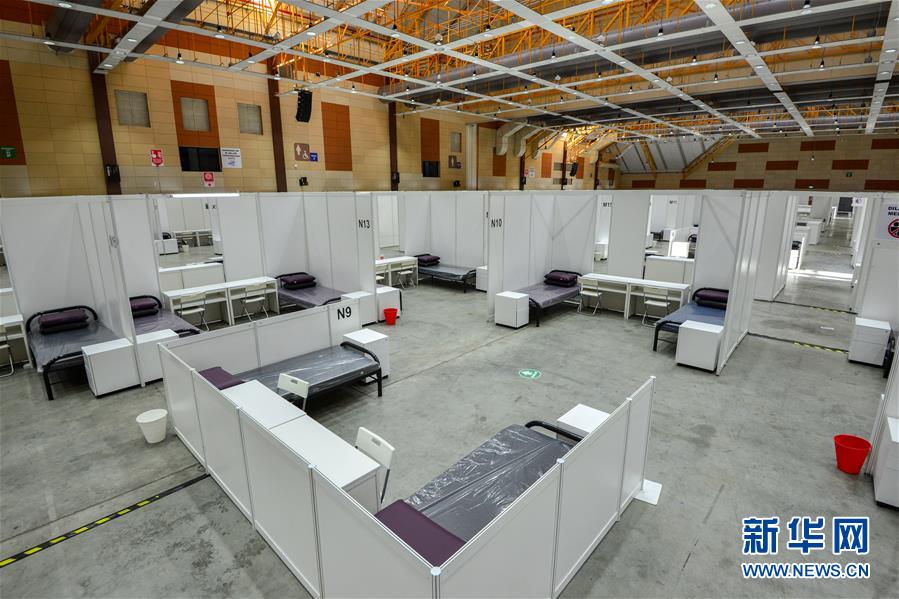 这是4月3日在马来西亚吉隆坡附近的沙登拍摄的方舱医院一角。 当日,马来西亚卫生部组织媒体预览位于沙登农业展览馆的方舱医院。这所方舱医院名为“低风险新冠肺炎隔离与治疗中心”,设有600余个床位,具备治疗室、抢救室、X光室和实验室等,收治无症状或者轻微症状的新冠肺炎确诊患者。随着医疗设备的到位,这所方舱医院便可投入使用。 新华社发(张纹综摄)