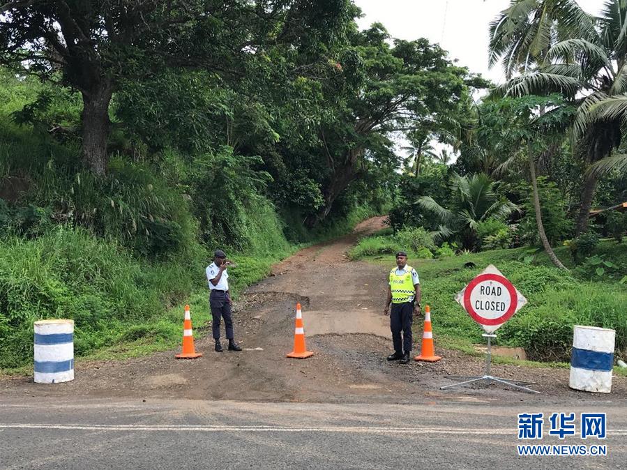4月5日,在斐济瓦努阿岛,警方在有新冠肺炎确诊病例居住的索阿索阿附近设立临时检查站,执行封锁任务。新华社发(斐济太阳报提供)