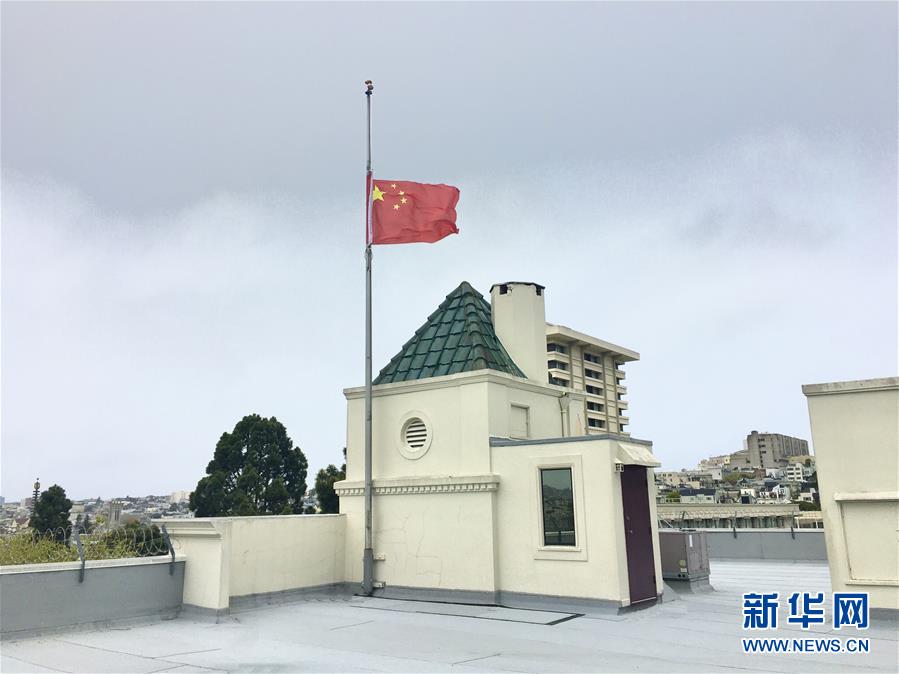 中国驻美国大使馆下半旗志哀抗疫烈士和逝世同胞