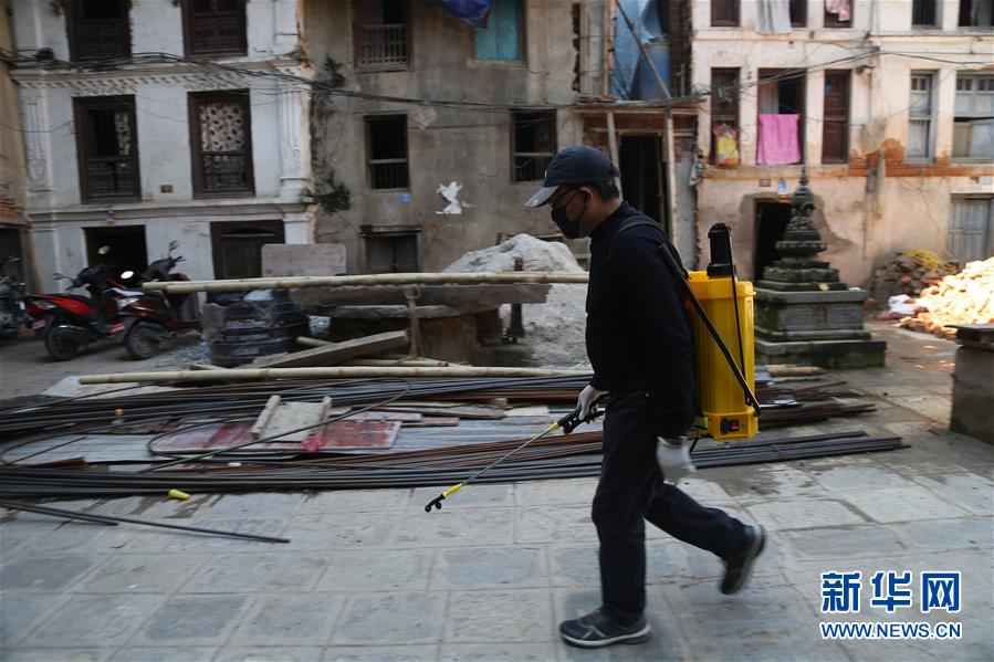 4月5日,在尼泊尔加德满都,一名志愿者在进行消毒工作。新华社发(苏尼尔·夏尔马摄)