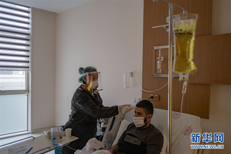4月5日,在土耳其伊斯坦布尔,一名医护人员佩戴3D打印技术制作出来的防护面罩。新华社发(亚辛·阿克居尔 摄)