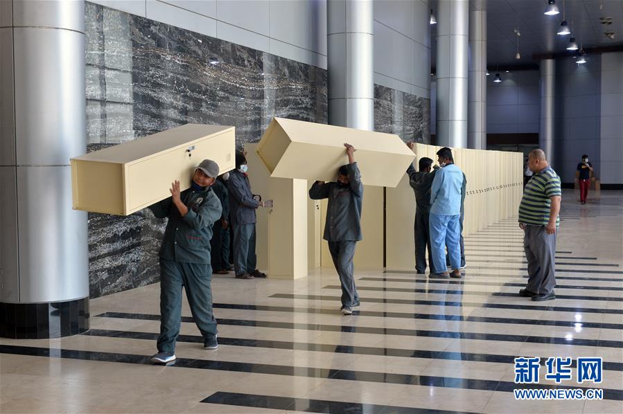 4月6日,在科威特哈瓦利省国际展览中心,工人向新建的隔离中心内搬运储物柜。 当日,科威特哈瓦利省国际展览中心建设完成一处新冠肺炎隔离中心,用于接收隔离人员。科威特卫生部6日宣布,过去24小时新增109例新冠肺炎病例,累计确诊665例。 新华社发(阿萨德摄)