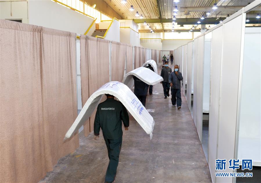 4月6日,在科威特哈瓦利省国际展览中心,工人们向新建的隔离中心内搬运床垫。 当日,科威特哈瓦利省国际展览中心建设完成一处新冠肺炎隔离中心,用于接收隔离人员。科威特卫生部6日宣布,过去24小时新增109例新冠肺炎病例,累计确诊665例。 新华社发(阿萨德摄)