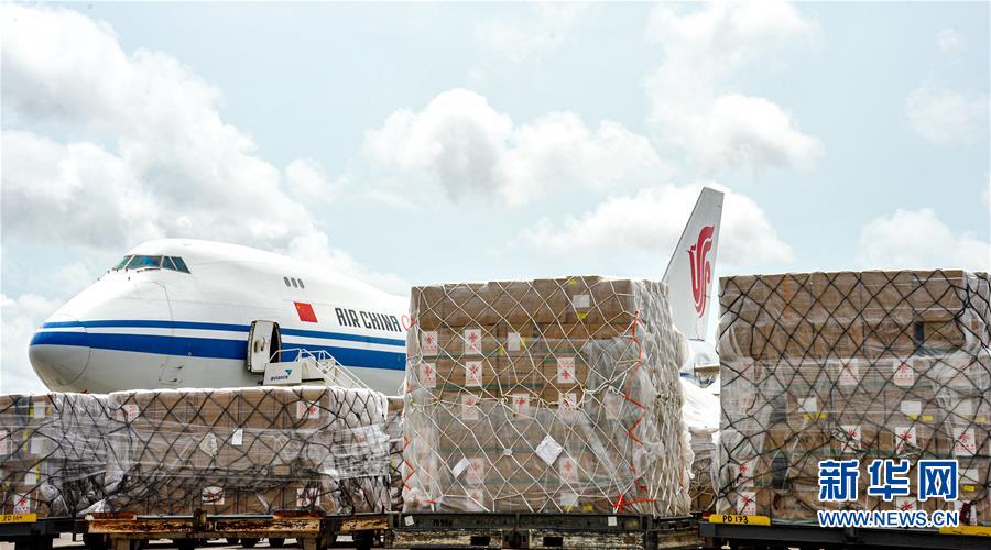 这是4月6日在加纳首都阿克拉的科托卡国际机场拍摄的部分已经卸载下来的物资。 中国援助18个非洲国家的抗疫物资6日运抵加纳。除加纳外,这批物资还将在这里中转运往其他17个国家,以帮助当地抗击新冠疫情。 新华社记者 许正 摄