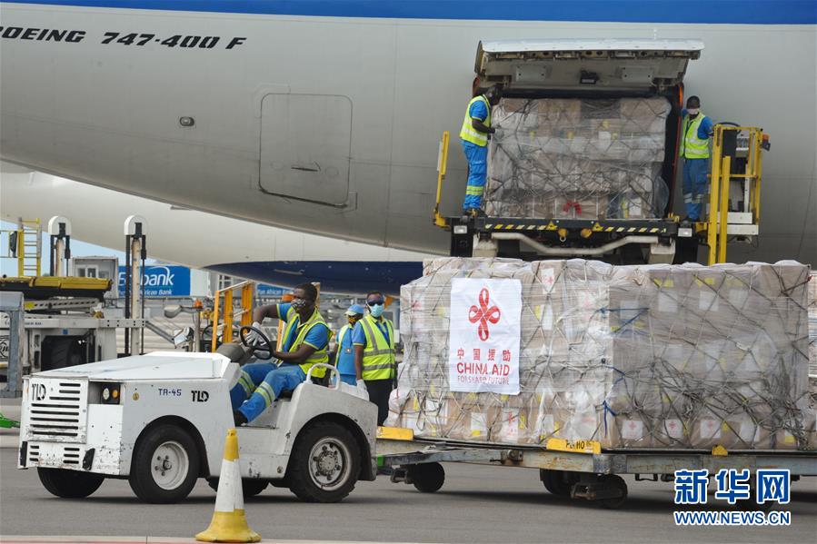 4月6日,加纳首都阿克拉的科托卡国际机场工作人员从包机上卸载物资。 中国援助18个非洲国家的抗疫物资6日运抵加纳。除加纳外,这批物资还将在这里中转运往其他17个国家,以帮助当地抗击新冠疫情。 新华社记者 许正 摄