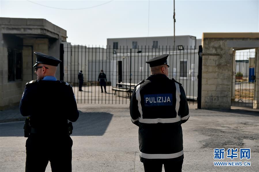 4月6日,在马耳他南部的比尔泽布贾,两名警察站在难民营外。 马耳他南部一座难民营5日因新冠疫情而实施封闭措施,目前已出现多个确诊病例。 新华社发(乔纳森·博尔格摄)