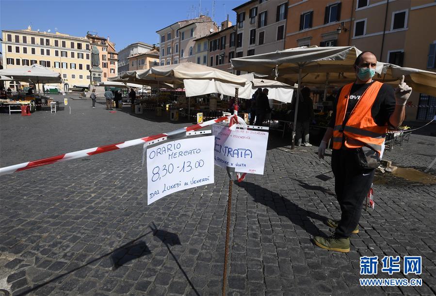 4月6日,在意大利首都罗马,一位工作人员在一个市场的入口控制顾客人数。 意大利民事保护部门负责人、新冠病毒应急委员会专员博雷利6日表示,截至当天18时,意大利累计确诊病例增至132547例,比上一日增加3599例,新增病例连续两天下降。 新华社发(奥古斯托·卡萨索利摄)