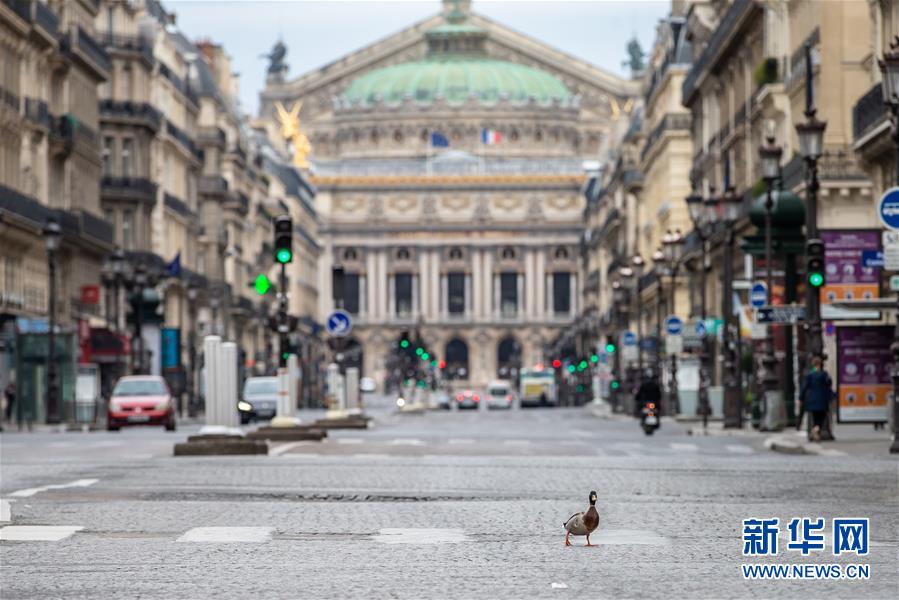 4月6日,在法国巴黎,一只鸭子在巴黎歌剧院前的大道上“溜达”。 法国自3月17日起实施“禁足令”,要求民众留在家中,最大限度减少出行并避免与外界接触。“禁足令”实施期间,不少动物“溜达”到巴黎空荡无人的大街上。 新华社发(奥雷利安·莫里萨尔摄)