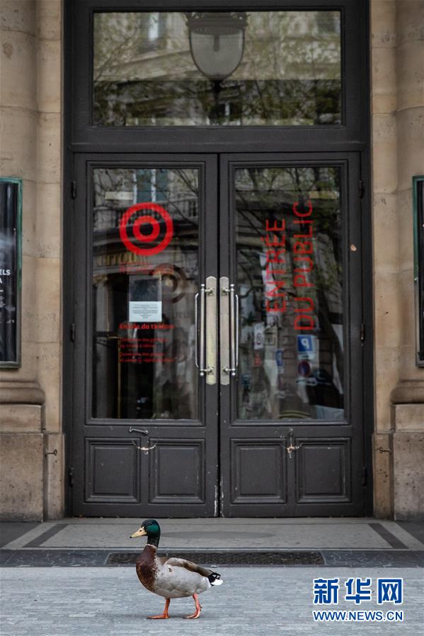 4月6日,在法国巴黎,一只鸭子在巴黎歌剧院前的大道上“溜达”。 法国自3月17日起实施“禁足令”,要求民众留在家中,最大限度减少出行并避免与外界接触。“禁足令”实施期间,不少动物“溜达”到巴黎空荡无人的大街上。 新华社发(奥雷利安·莫里萨尔摄)