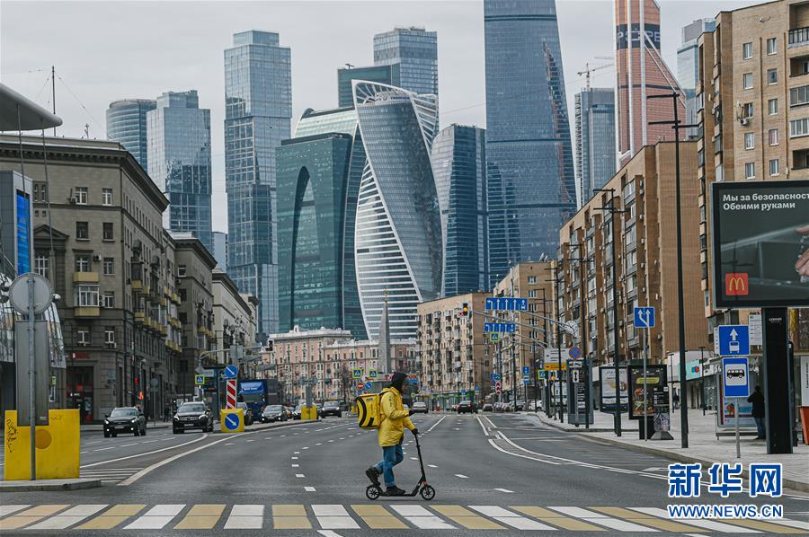4月7日,在俄罗斯首都莫斯科,一名送餐员穿过马路。 新华社发(叶甫盖尼·西尼岑摄)