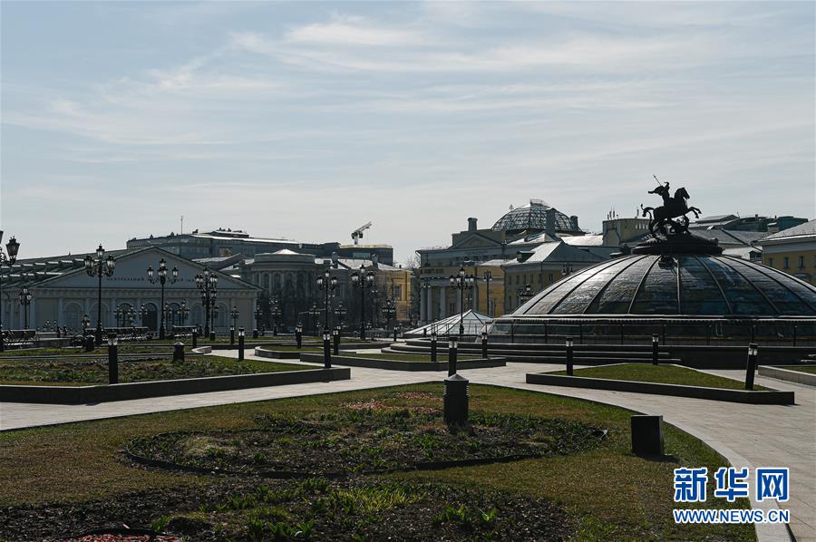 这是4月7日在俄罗斯首都莫斯科拍摄的空旷的马涅什广场。 新华社发(叶甫盖尼·西尼岑摄)