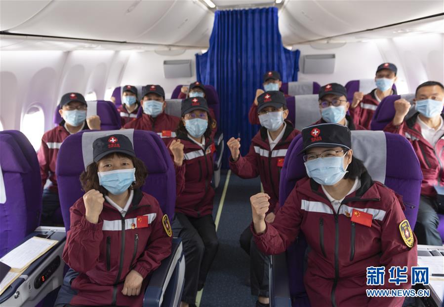 4月8日,在昆明长水机场,中国赴缅甸抗疫医疗专家组在机舱合影。 当日,应缅甸政府邀请,中国抗疫医疗专家组乘机从云南昆明启程赴缅甸协助开展疫情防控工作。 新华社发(陈欣波 摄)