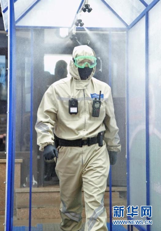 4月8日,在哈萨克斯坦首都努尔苏丹,身着可重复使用的防护制服的警务人员走过喷雾消毒通道。 哈萨克斯坦内务部近日向在封城隔离点执勤的160名警务人员发放了特制的可重复使用的防护制服。执勤任务结束后,警员可通过喷雾消毒通道对防护服进行消毒。截至北京时间7日15时,哈萨克斯坦新增新冠肺炎确诊病例101例,累计确诊病例685例,其中死亡6例,治愈47例。 新华社发