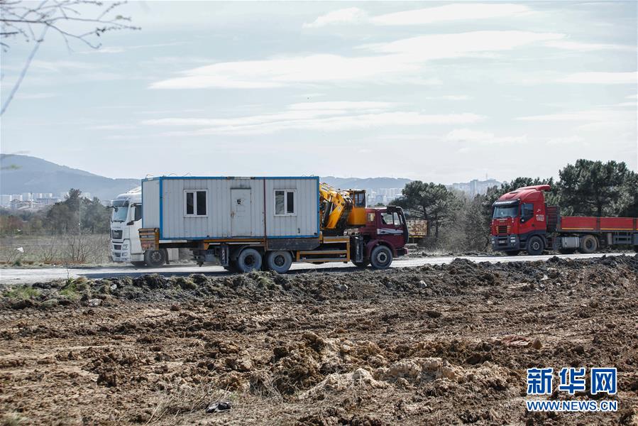 4月7日,在土耳其伊斯坦布尔,施工人员开始建设方舱医院。 土耳其总统埃尔多安6日表示,将在45天之内,在伊斯坦布尔省建成两座方舱医院,每座医院都有约1000张床位。 新华社发(阿里·卡亚摄)