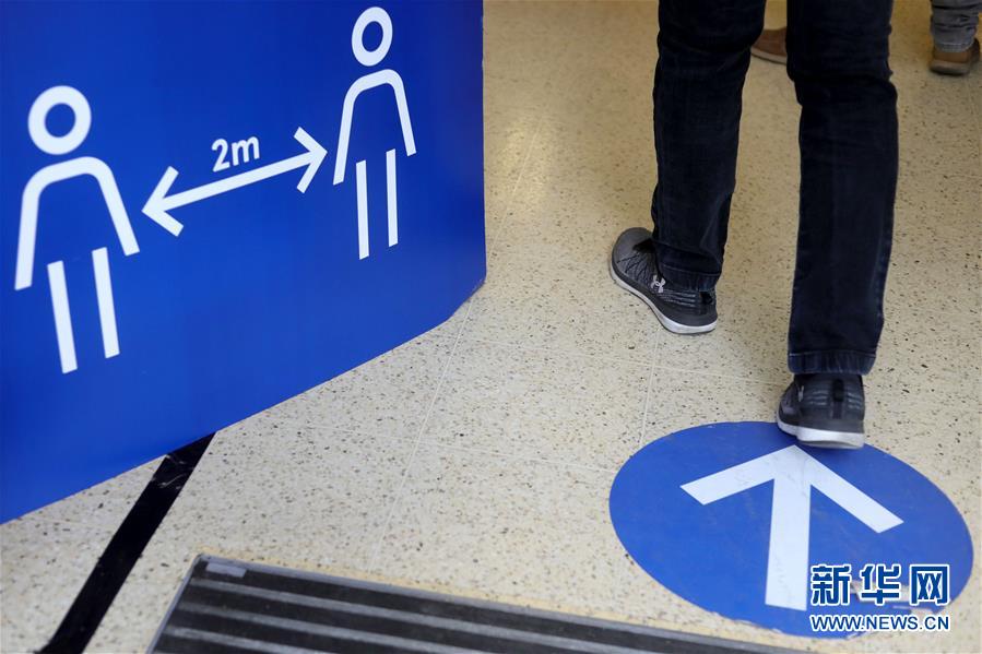 4月8日,在英国伦敦,一家超市的地面上贴着提醒人们保持安全距离的贴纸。 受新冠疫情影响,英国伦敦很多公共场所都采取措施引导民众保持“社交距离”。 新华社发(蒂姆·爱尔兰摄)