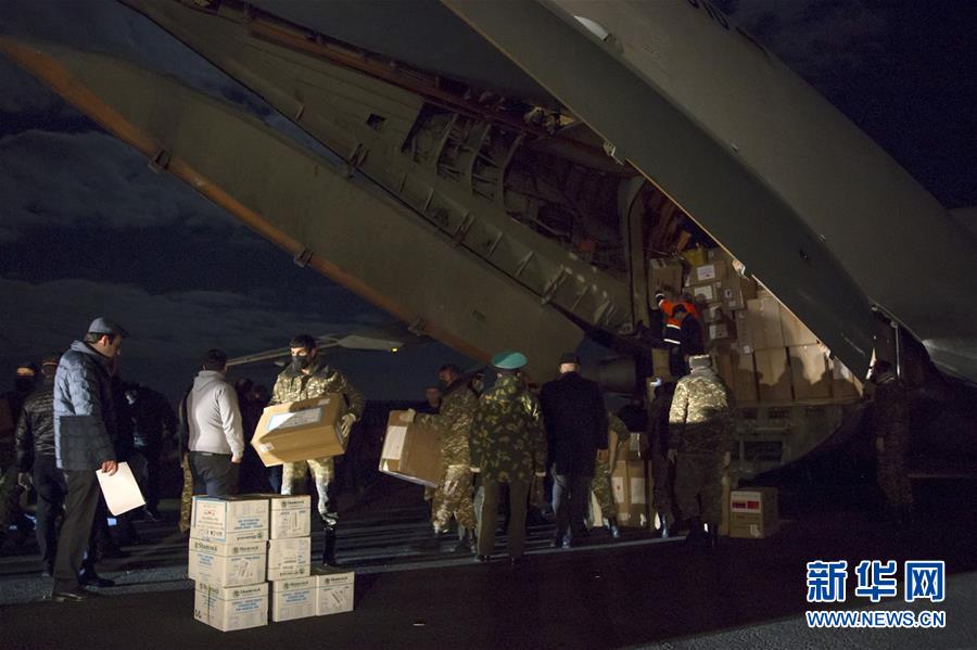 4月8日晚,在亚美尼亚首都埃里温兹瓦尔特诺茨机场,工作人员从飞机上卸下中国援助亚美尼亚的抗疫物资。 新华社发(亚美尼亚外交部供图)