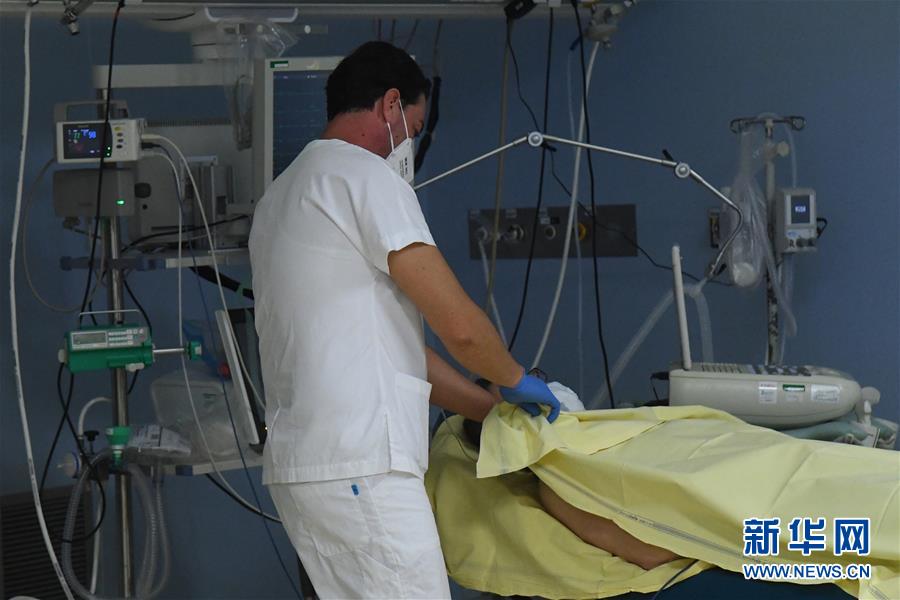 4月9日,在意大利博洛尼亚的圣奥尔索拉—马尔皮吉医院,医护人员看护病人。 新华社发(詹尼·斯基基摄)