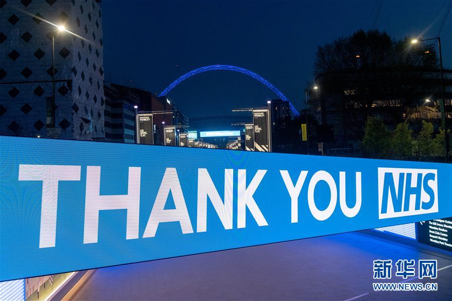 这是4月9日拍摄的的英国伦敦温布利球场亮灯并打出“感谢NHS(英国国民保健制度)”的标语。 英国伦敦温布利球场4月9日晚八时点亮象征英国国民保健制度(NHS)的蓝灯,以示对抗击新冠肺炎疫情的医护人员的敬意。众多市民在自家阳台或窗前鼓掌,向医护人员致敬。 新华社发(雷伊·唐摄)