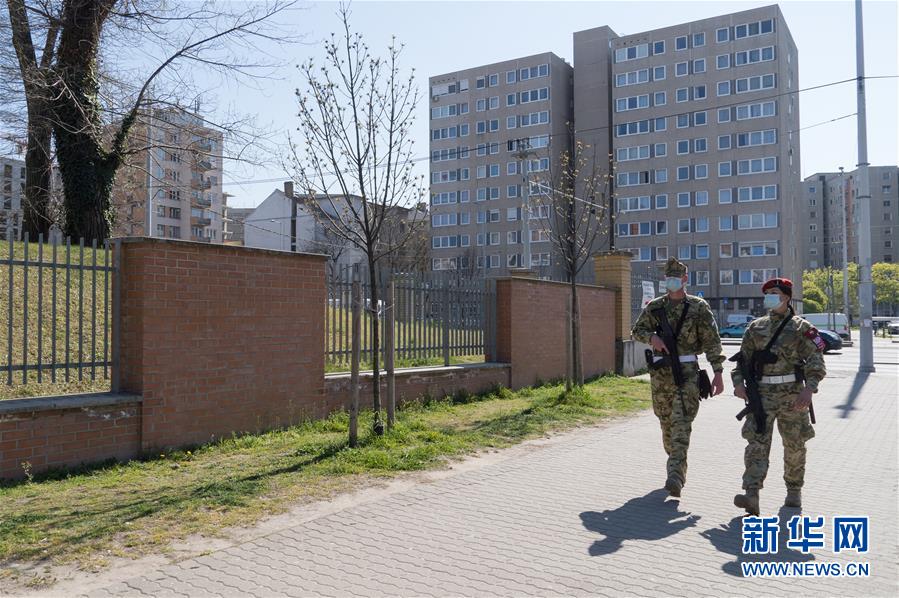 4月9日,在匈牙利布达佩斯,两名戴口罩的军警在街头巡逻。 匈牙利总理欧尔班9日宣布,匈牙利将无限期延长此前发布的出行限制令,但会根据实际情况每周评估一次,以决定是否继续延长。匈牙利自3月28日起实施出行限制令,民众除工作和购买生活必需品等情况外严禁离开住所。该限制令为期两周,将于4月11日到期。 新华社发(弗尔季·奥蒂洛摄)