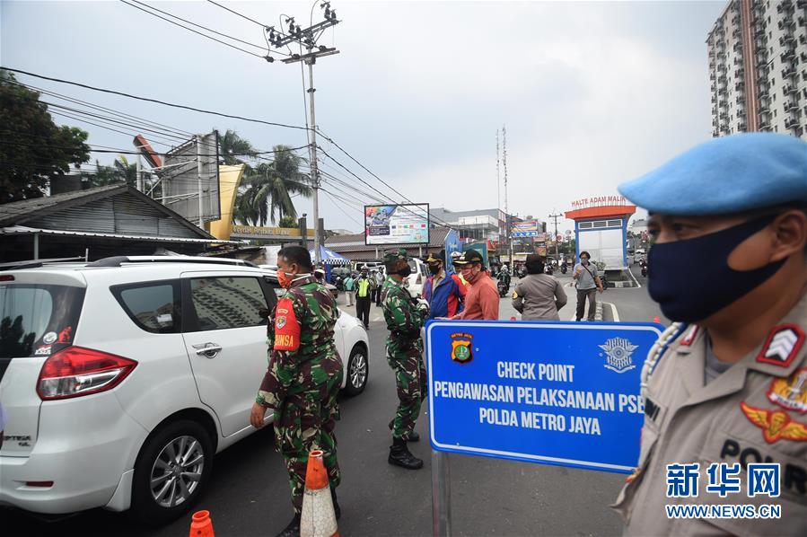 4月10日,在印度尼西亚雅加达,印尼士兵与警察在一处检查站值勤。 据印尼媒体报道,印尼卫生部7日同意了雅加达政府关于实施大规模社交限制措施的请求,以更好地抗击新冠疫情。这些措施包括关闭学校和办公场所,限制社会文化、交通运输和宗教活动,以及仅允许开展有限的国防和安全活动。 新华社发(祖卡南摄)