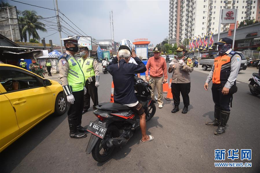 4月10日,在印度尼西亚雅加达,印尼警察在一处检查站值勤。 据印尼媒体报道,印尼卫生部7日同意了雅加达政府关于实施大规模社交限制措施的请求,以更好地抗击新冠疫情。这些措施包括关闭学校和办公场所,限制社会文化、交通运输和宗教活动,以及仅允许开展有限的国防和安全活动。 新华社发(祖卡南摄)