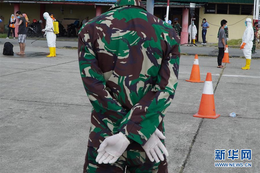 4月10日,在印度尼西亚北苏门答腊省一处空军基地,从马来西亚回国的印尼务工人员接受消毒。 据印尼媒体报道,印尼卫生部7日同意了雅加达地方政府关于实施大规模社交限制措施的请求,以更好地抗击新冠疫情。这些措施包括关闭学校和办公场所,限制社会文化、交通运输和宗教活动,以及仅允许开展有限的国防和安全活动。 新华社发(拉纳·普里玛摄)