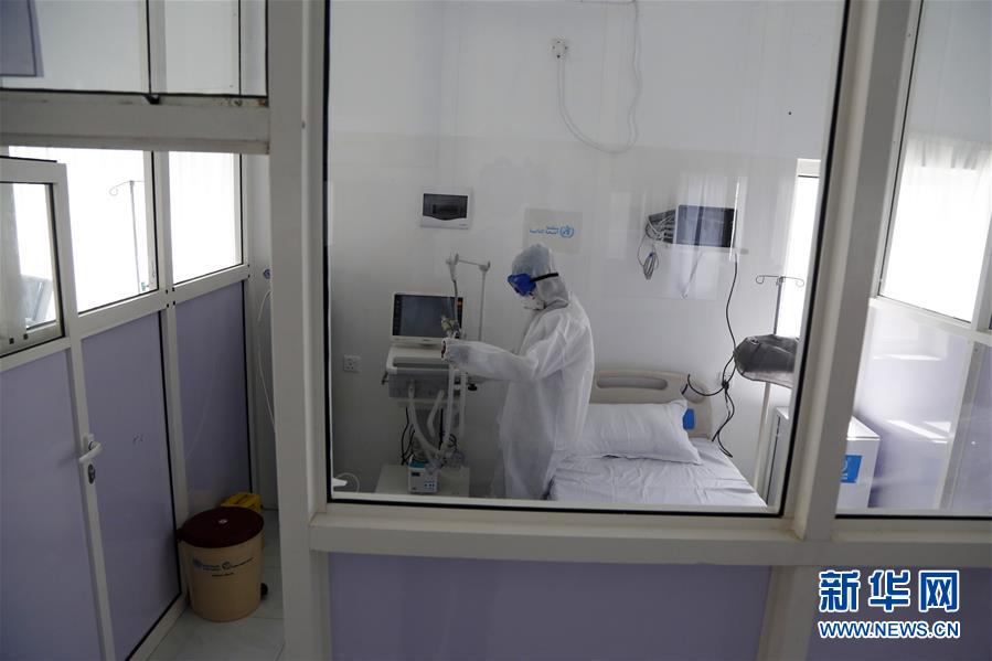 4月11日,在也门萨那的一所医院,工作人员查看隔离中心内的医疗设备。新华社发(穆罕默德·穆罕默德摄)