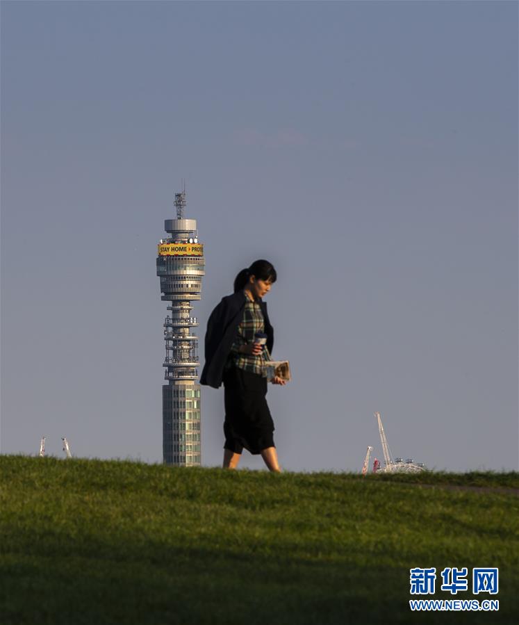 4月11日,在英国伦敦,一名女士在山坡上行走,远处的英国电信公司塔顶上显示“待在家中”字样。 英国卫生部4月11日发布的新冠疫情数字显示,该国累计的死亡病例数已达到9875例,与前一天的官方数字相比新增917例;累计确诊病例达到78991例。 新华社记者 韩岩 摄
