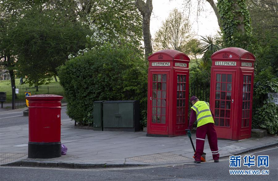 4月11日,在英国伦敦,一名清洁工人在红色电话亭和邮筒旁清扫路面。 英国卫生部4月11日发布的新冠疫情数字显示,该国累计的死亡病例数已达到9875例,与前一天的官方数字相比新增917例;累计确诊病例达到78991例。 新华社记者 韩岩 摄