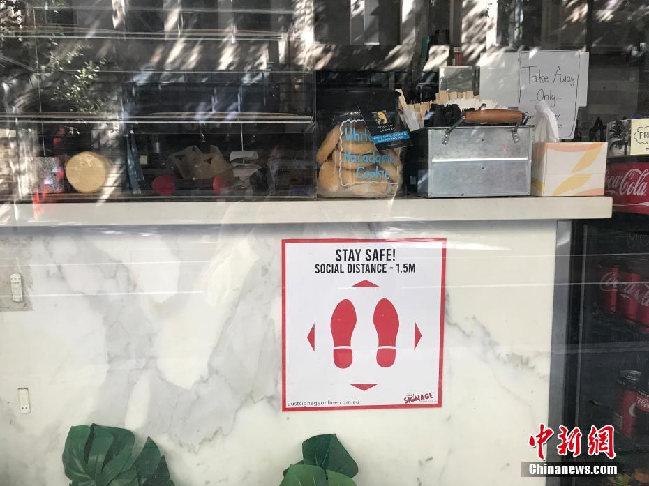 当地时间4月12日,复活节假期,悉尼市民减少外出,街头罕见人迹。图为一家咖啡店已关门,“保持社交距离”的提示十分醒目。中新社记者 陶社兰 摄