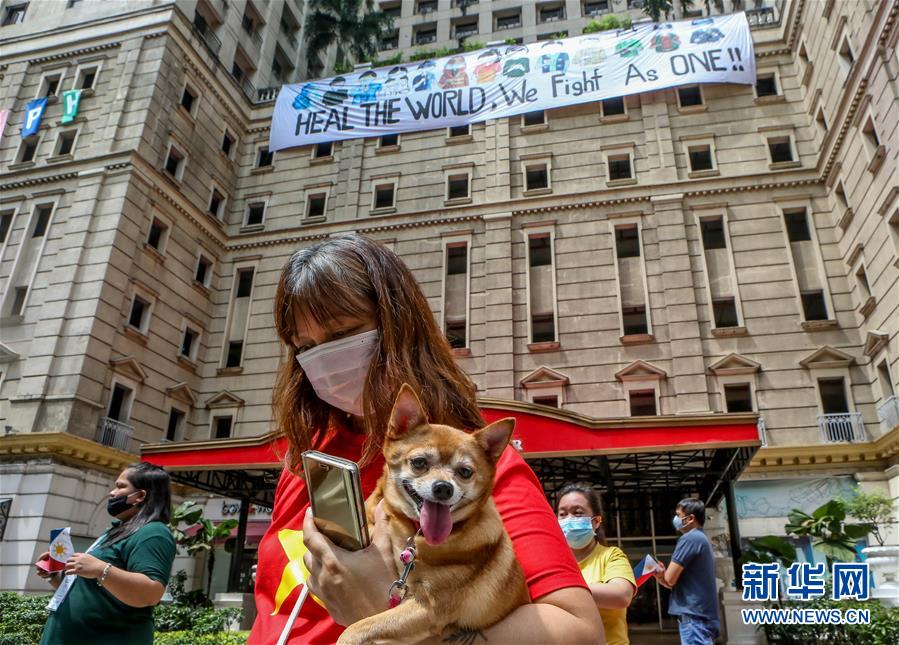 4月12日,在菲律宾奎松城,人们在居民楼上拉出横幅,表达对在医护一线与病毒对抗的医护工作者的支持。 新华社发(乌马利摄)