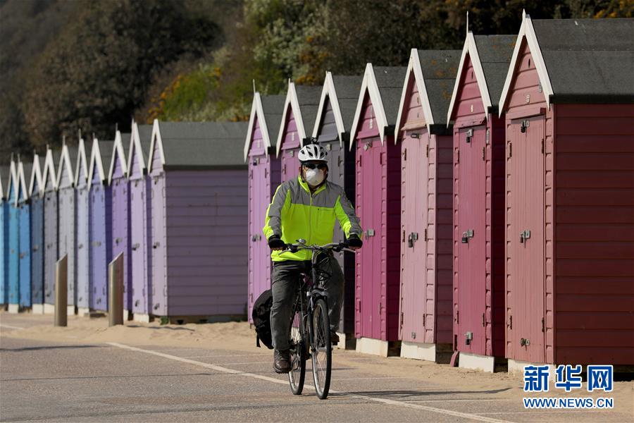 4月11日,在英国南部伯恩茅斯,一名戴着口罩的男士从海边小屋旁骑行。 新华社发(蒂姆·爱尔兰摄)