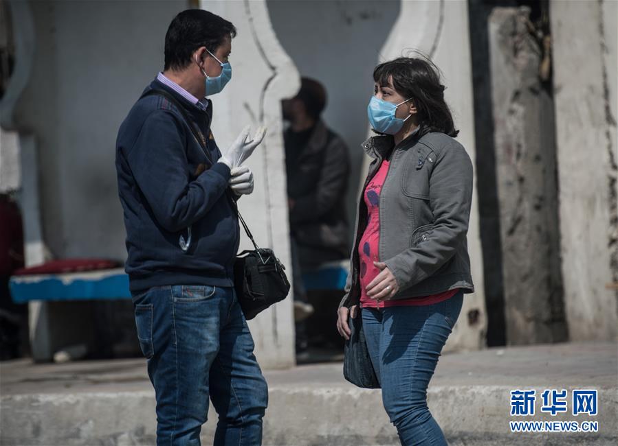 4月12日,在埃及首都开罗,戴口罩的行人在街头交谈。 埃及卫生部12日晚说,埃及境内新增新冠确诊病例126例,累计确诊病例2065例;新增死亡病例13例,累计死亡病例159例。 新华社记者 邬惠我 摄