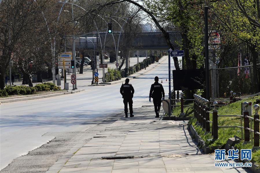 4月12日,在土耳其首都安卡拉,警察在空旷的道路上巡逻。 土耳其内政部10日宣布,从11日0时起至12日24时,包括首都安卡拉、伊斯坦布尔等大城市所在省份在内,土耳其有31个省实施48小时“居家令”,以遏制新冠病毒传播。 新华社发(穆斯塔法·卡亚摄)