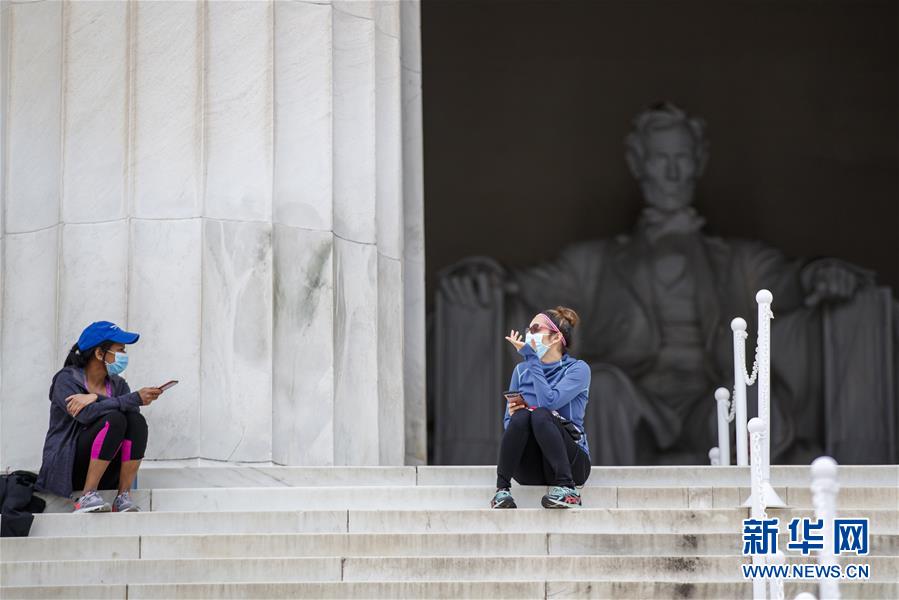 4月12日,两名戴口罩的女子在美国首都华盛顿的林肯纪念堂保持距离交谈。 美国约翰斯·霍普金斯大学12日发布的新冠疫情最新统计数据显示,美国确诊病例超过55万例,是全球确诊病例最多的国家。 新华社发(沈霆 摄)