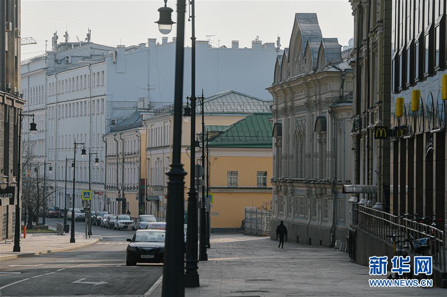 这是4月13日在俄罗斯首都莫斯科拍摄的空旷街道。 根据俄罗斯防疫指挥部13日公布的最新数据,在过去24小时内,俄罗斯境内新增新冠确诊病例2558例,累计确诊病例增至18328例,死亡148例,治愈出院1470例。 新华社发(叶甫盖尼·西尼岑 摄)