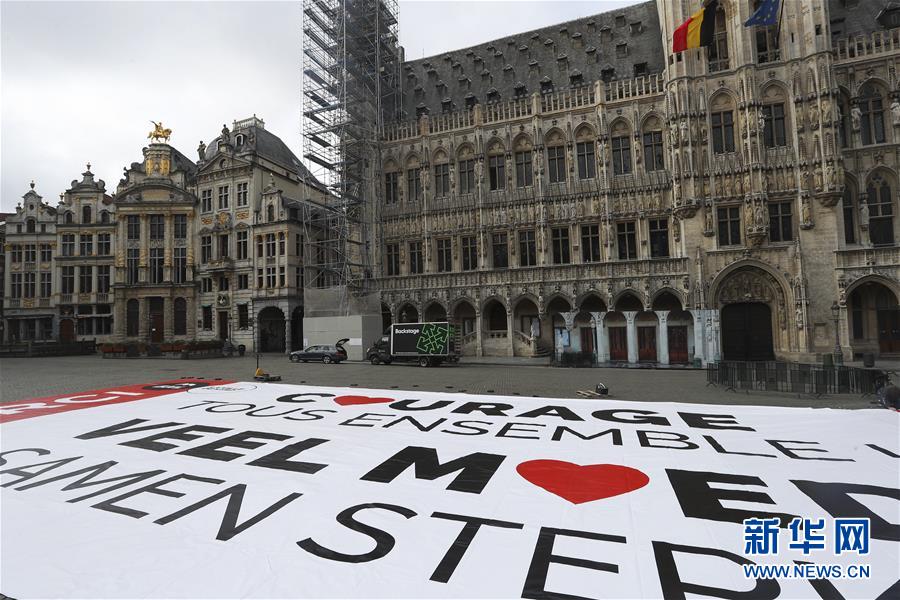 这是4月13日在比利时布鲁塞尔大广场拍摄的为抗击疫情加油的巨幅海报。 当日,比利时布鲁塞尔市政府工作人员在市中心的大广场展开一面巨幅海报,上面用法语和荷兰语印着“一起鼓起勇气”“谢谢”,以感谢市民及医疗人员为抗击疫情所做的努力。 新华社记者郑焕松摄